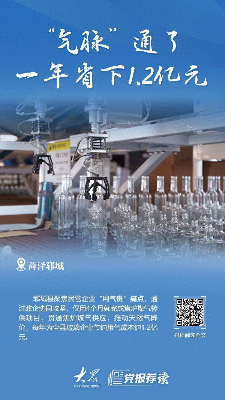 郓城县聚焦民营企业“用气贵”痛点,通过政企协同攻坚,仅用4个月就完成焦炉煤气转供项目,贯通焦炉煤气供应,推动天然气降价,每年为全县玻璃企业节约用气成本约1.2亿元。