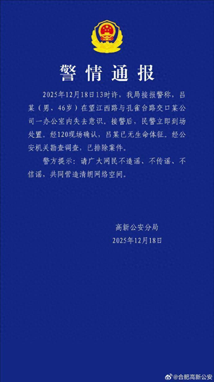 12月18日13时许,我局接报警称,吕某(男,46岁)在望江西路与孔雀台路交口某公司一办公室内失去意识。接警后,民警立即到场处置。经120现场确认,吕某已无生命体征。经公安机关勘查调查,已排除案件。