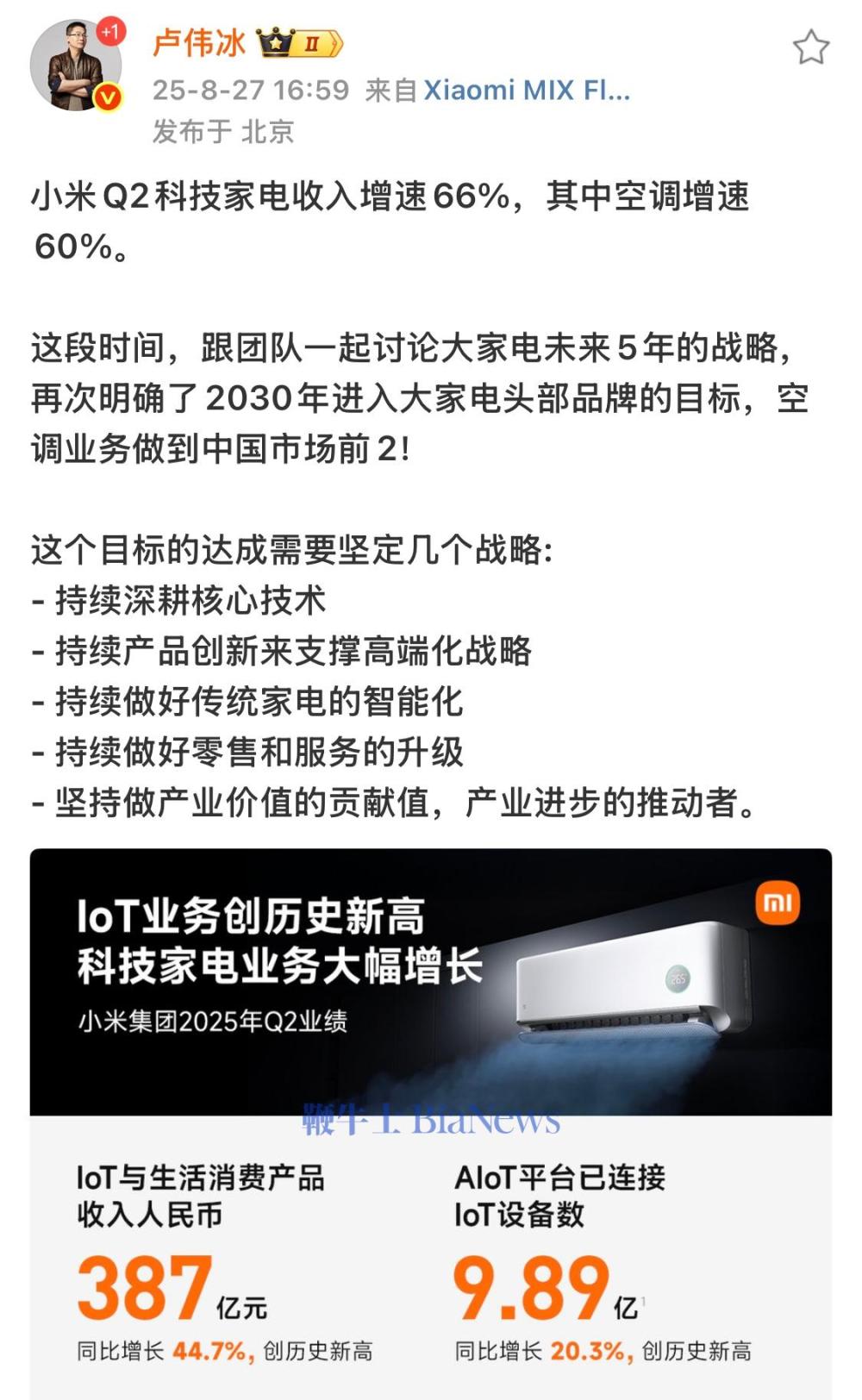 8月27日,小米高管卢伟冰发文称,小米Q2科技家电收入增速66%,其中空调增速60%。