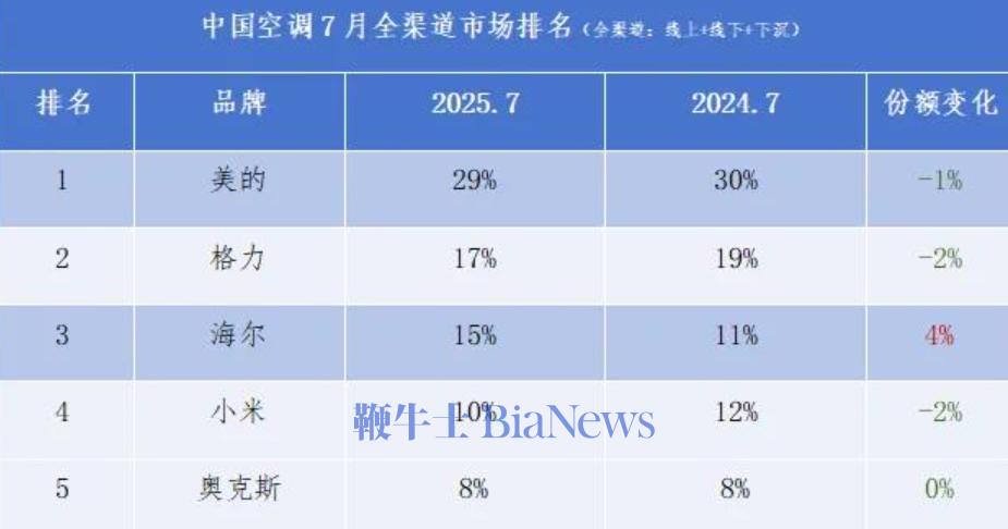 据奥维云网7月份全渠道(线上+线下)空调销量数据。数据显示,空调行业前三甲是:美的29%、格力17%、海尔15%。