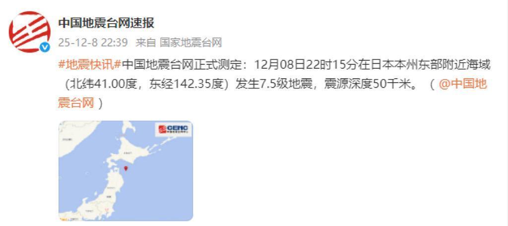 中国地震台网正式测定:12月08日22时15分在日本本州东部附近海域(北纬41.00度,东经142.35度)发生7.5级地震,震源深度50千米。