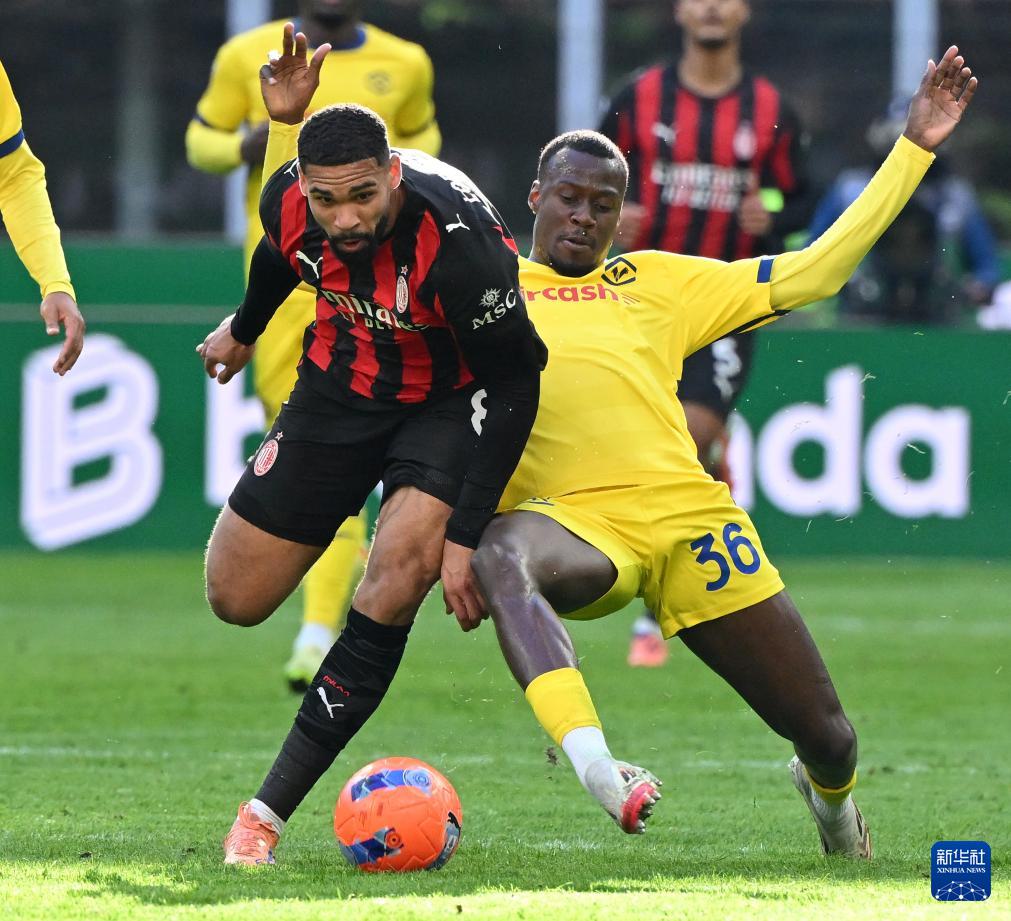 12月28日,AC米兰队球员洛夫特斯-奇克(左)与维罗纳队球员尼亚斯在比赛中拼抢。
